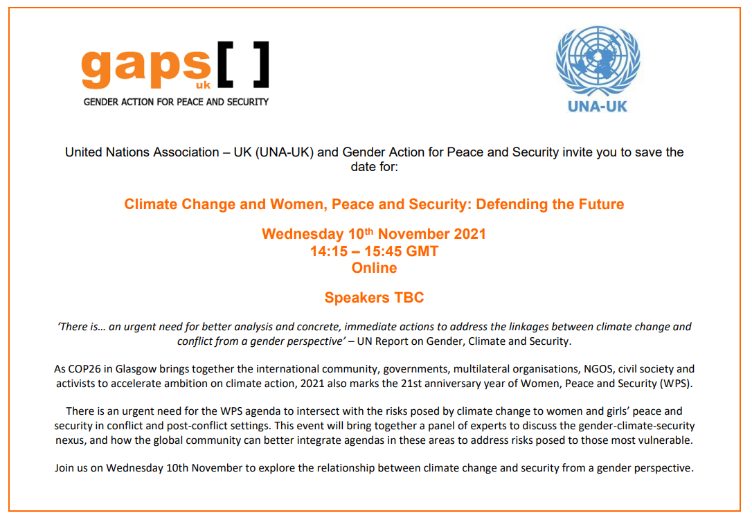 We are delighted to invite you to join us at GAPS and UNA-UK's upcoming event Climate Change and Women, Peace and Security: Defending the Future.