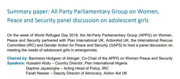 On the week of World Refugee Day 2019, the All-Party Parliamentary Group (APPG) on Women, Peace and Security partnered with Plan International UK, ActionAid UK, the International Rescue Committee (IRC), and Gender Action for Peace and Security (GAPS) to host a panel discussion on meeting the needs of adolescent girls in emergencies.