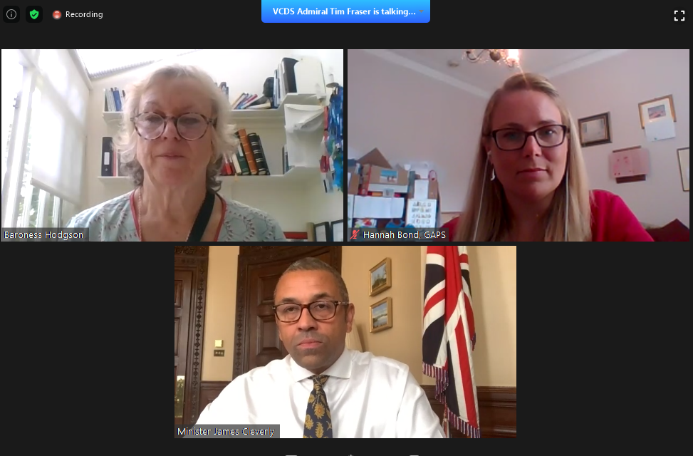Both Minister Cleverly and Admiral Tim Fraser noted that the UK Government as leading by example and will continue seek to promote gender equality on the world stage. This includes not only work at the multilateral level, but also reinforcing these measures in the domestic level. The new FCDO department and the MOD ensured civil society that they will continue to push on gender equality, which GAPS and the APPG-WPS will continue to monitor.