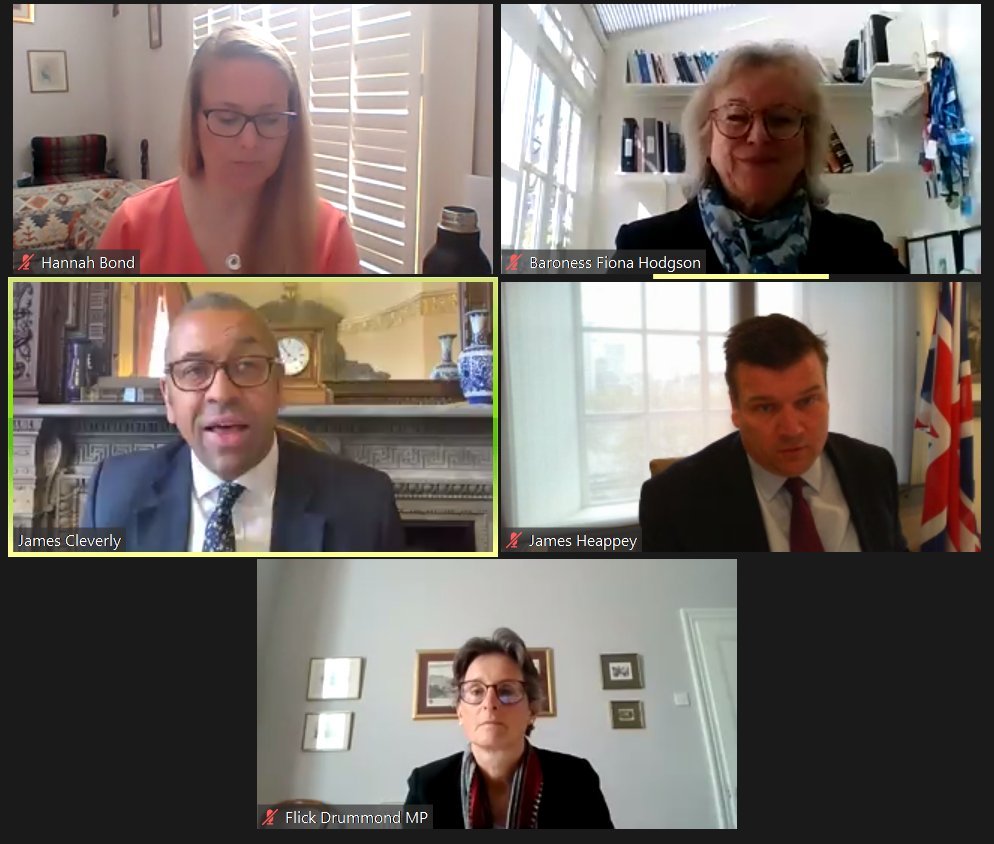 First, we heard from James Cleverly MP, Minister for Middle East and North Africa at the FCDO. Minister Cleverly began by giving reassurance that Women Peace and Security will remain a priority for the FCDO. He reflected on the challenges of the past year and how financial pressure has affected funding to gender equality work, but emphasised that the FCDO has remained committed to the issue as shown by the funding of GAPS’ Now and the Future – Pandemics and Crisis: Gender Equality, Peace and Security in a COVID-19 World and Beyond, the Conflict, Stability and Security Fund’s (CSSF) new portfolio on Gender, Peace and Security, and the funding of International Civil Society Action Network’s protection framework for women peacebuilders.