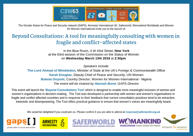 GAPS – along with GAPS members Women for Women International UK, Womankind Worldwide, Saferworld and Amnesty International UK – will host the event "Beyond Consultations: A tool for meaningfully consulting with women in fragile and conflict-affected states" on Wednesday 13 March, 14:30-16:00 in the Blue Room, 4 W 43rd Street, New York.