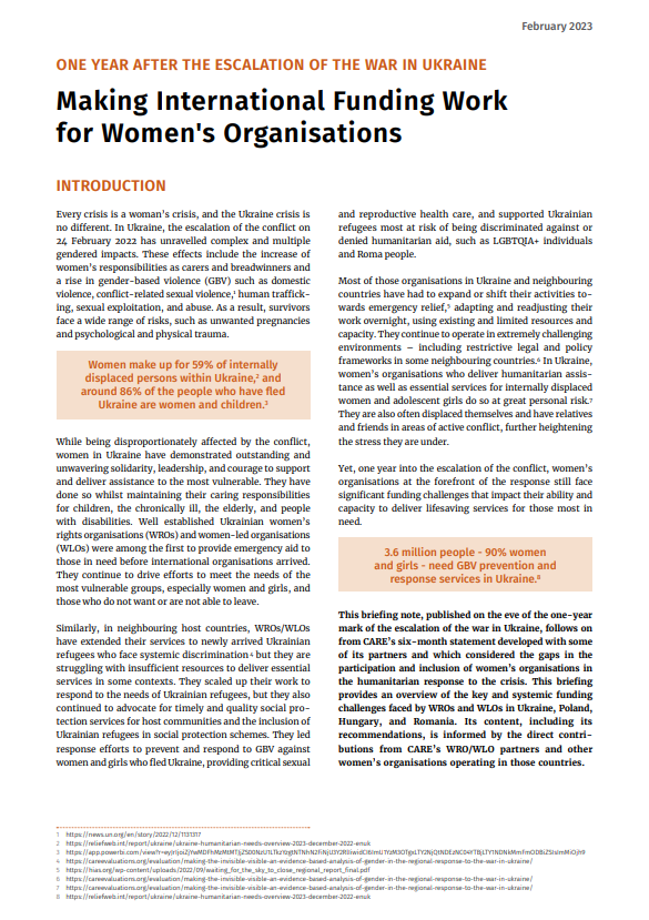 This briefing by Care International provides an overview of the key and systemic funding challenges faced by WROs and WLOs in Ukraine, Poland, Hungary, and Romania.