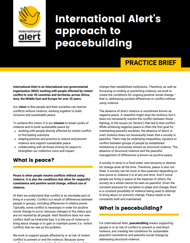 This practice brief outlines what International Alert mean by peace and peacebuilding, the reasons why peacebuilding is so important and how International Alert works to build peace.