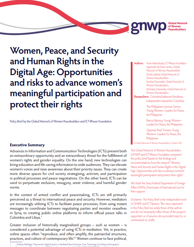 The Global Network of Women Peacebuilders (GNWP), in partnership with the ICT4Peace Foundation and with support from the Directorate of International Law of the Swiss Federal Department of Foreign Affairs (FDFA), developed this policy brief (#DigitalizingPeace), focused on women activists and peacebuilders. The brief explores how women can use ICTs to advance their work and how international organizations, governments, and private companies can support them.