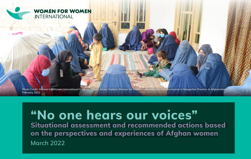 Situational assessment and recommended actions based on the perspectives and experiences of Afghan women. The report by Women for Women International follows interviews with Afghan women about their experiences, challenges and support mechanisms.