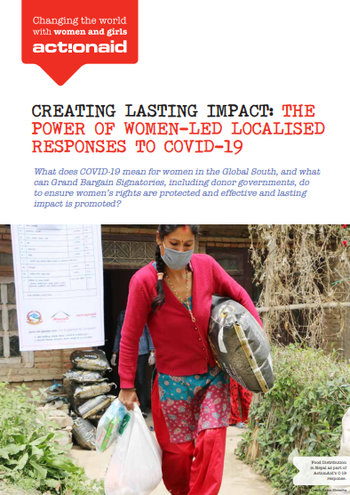 ActionAid's policy brief highlights why COVID-19 poses a significant threat to women’s rights, and makes a series of practical recommendations for COVID-19 response efforts to be driven by local women, including women’s groups, women-led organisations, women’s rights organisations, and women-led networks, as decision makers and partners. In this policy brief, ActionAid urge the international community, including donor governments, to promote women-led localised responses to COVID-19 by investing in women-led gender analysis and research to inform immediate and longer-term gendered response efforts, channelling resources directly to local women-led actors, and increasing women’s representation and power in decision-making spaces and structures at all levels.
