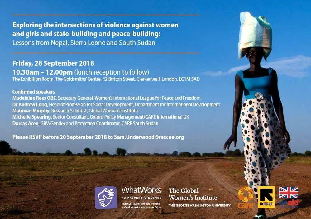 10:30-12:00, Friday 28 September 2018The Goldsmith's Centre, London. This event launches a study on gaps in evidence and understanding on violence against women and girls during post-conflict transition.