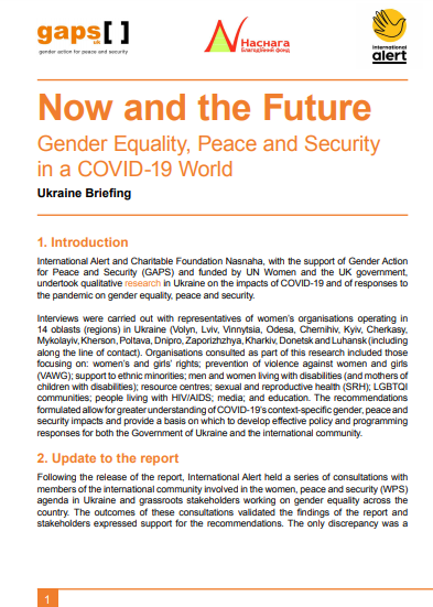 The Ukraine briefing as part of the Now and the Future - Pandemics and Crisis: Gender Equality, Peace and Security in a COVID-19 World and Beyond: Briefing looks at any changes to the COVID-19, peace, security and gender equality situation in Ukraine; any uptake of the recommendations and findings; the recommendations; and a summary of the overall project findings.